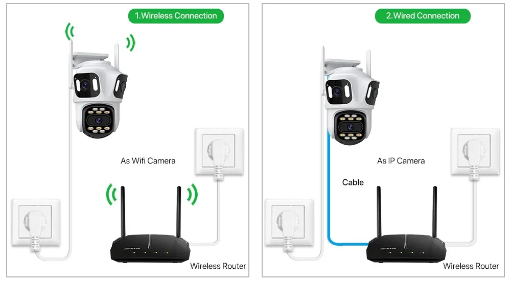 Alimentada por adaptador DC 12V, você pode conectar a câmera à rede Wi-Fi.você pode configurar a conexão wi-fi da câmera ou LAN Search com cabo de rede conectado ao roteador, trabalhar apenas com wi-fi 2.4G (não suporta 5G).